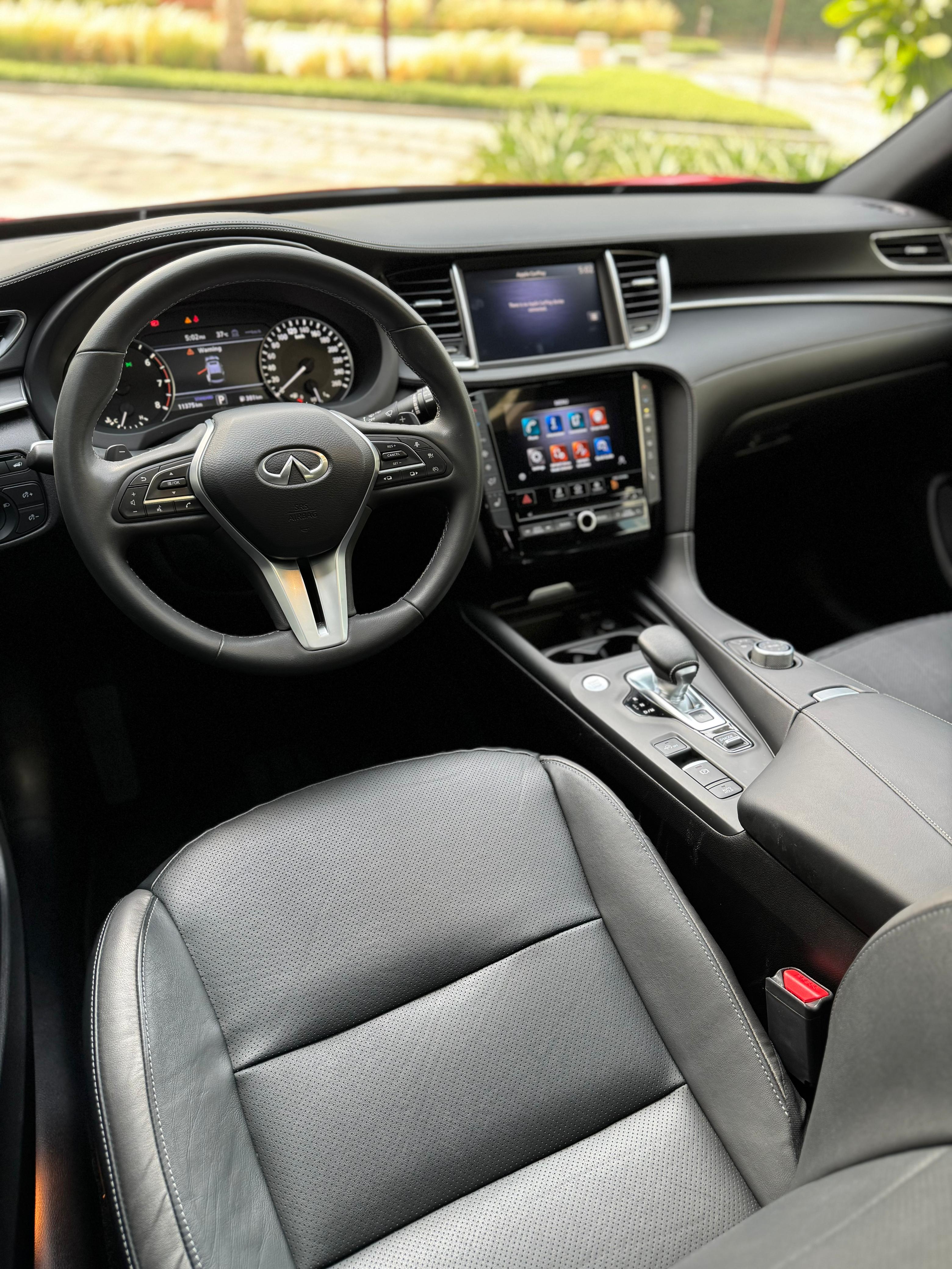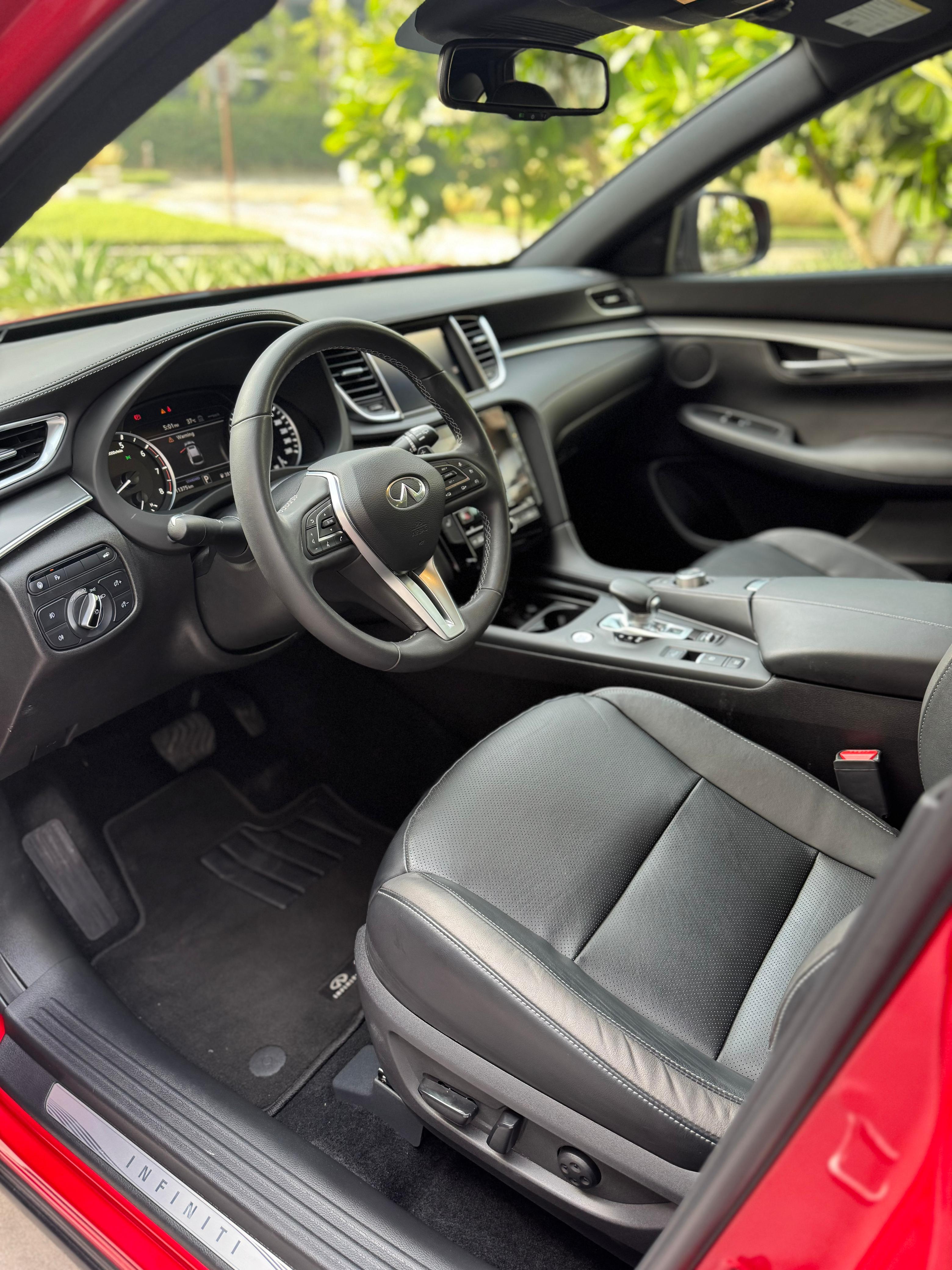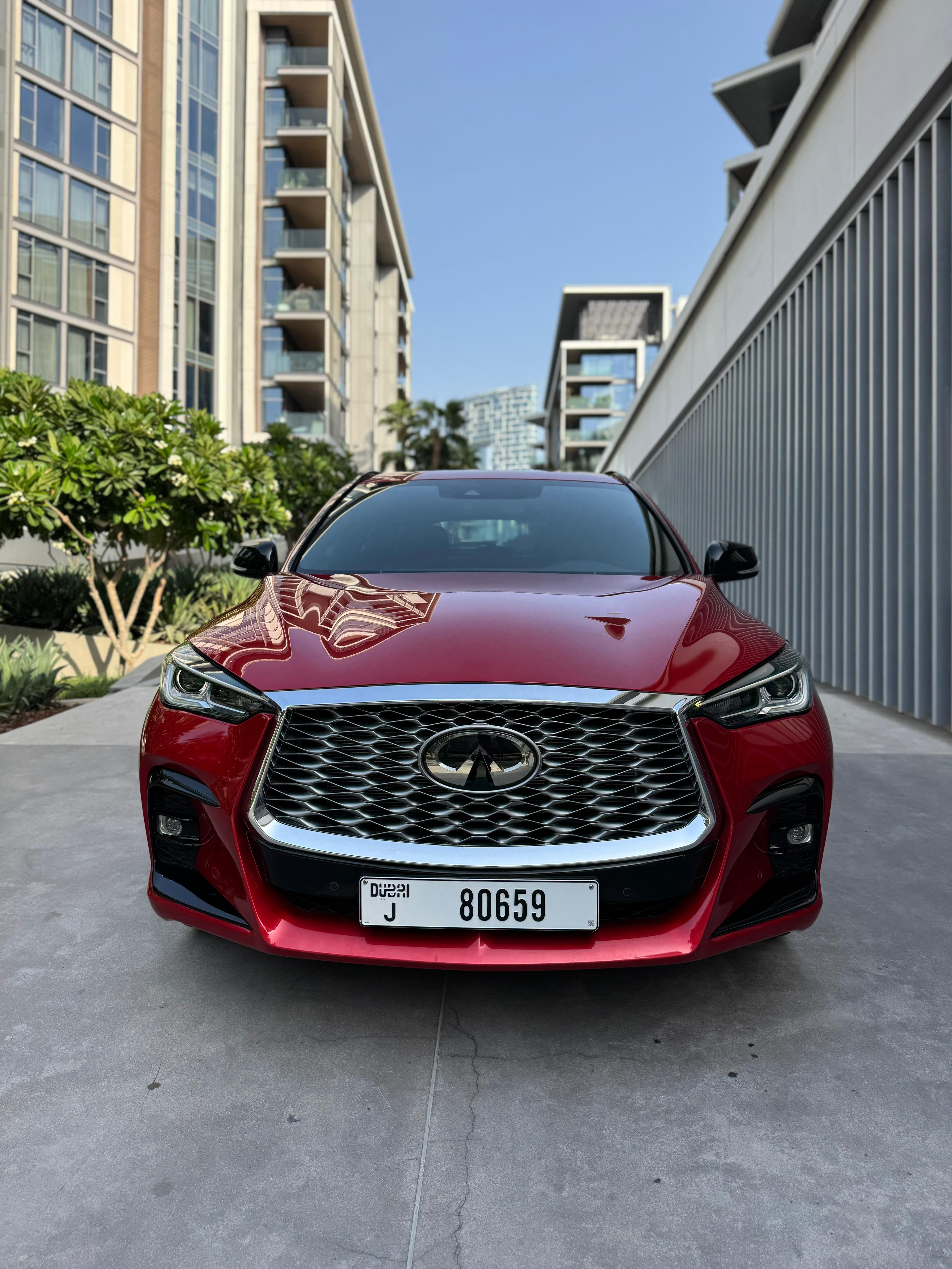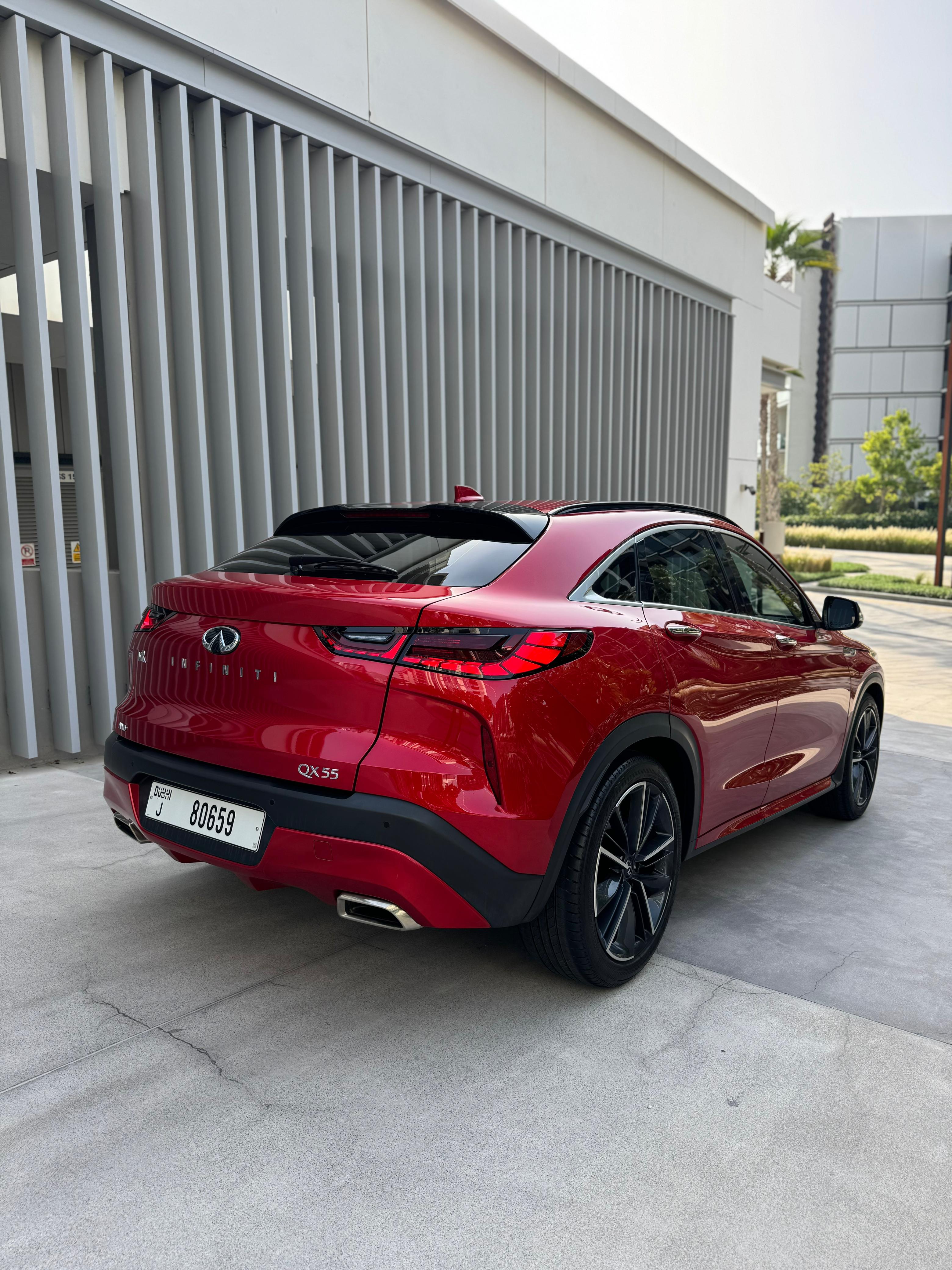 Infiniti QX55 – Model Year 2024 Specifications: Panoramic Sunroof Parking Sensors Power Seats LCD Screens Leather Seats Push Button Start Front Airbags Rear Air Conditioning Fabric Seats Alloy Wheels Why rent the Infiniti QX55? The Infiniti QX55 is a stylish crossover that offers a premium driving experience. With four doors and seating for up to five passengers, it also provides space for two medium-sized bags. This vehicle is equipped with a range of modern features, including a panoramic sunroof, parking sensors, power-adjustable seats, LCD screens, leather upholstery, and front airbags—ensuring both comfort and safety.