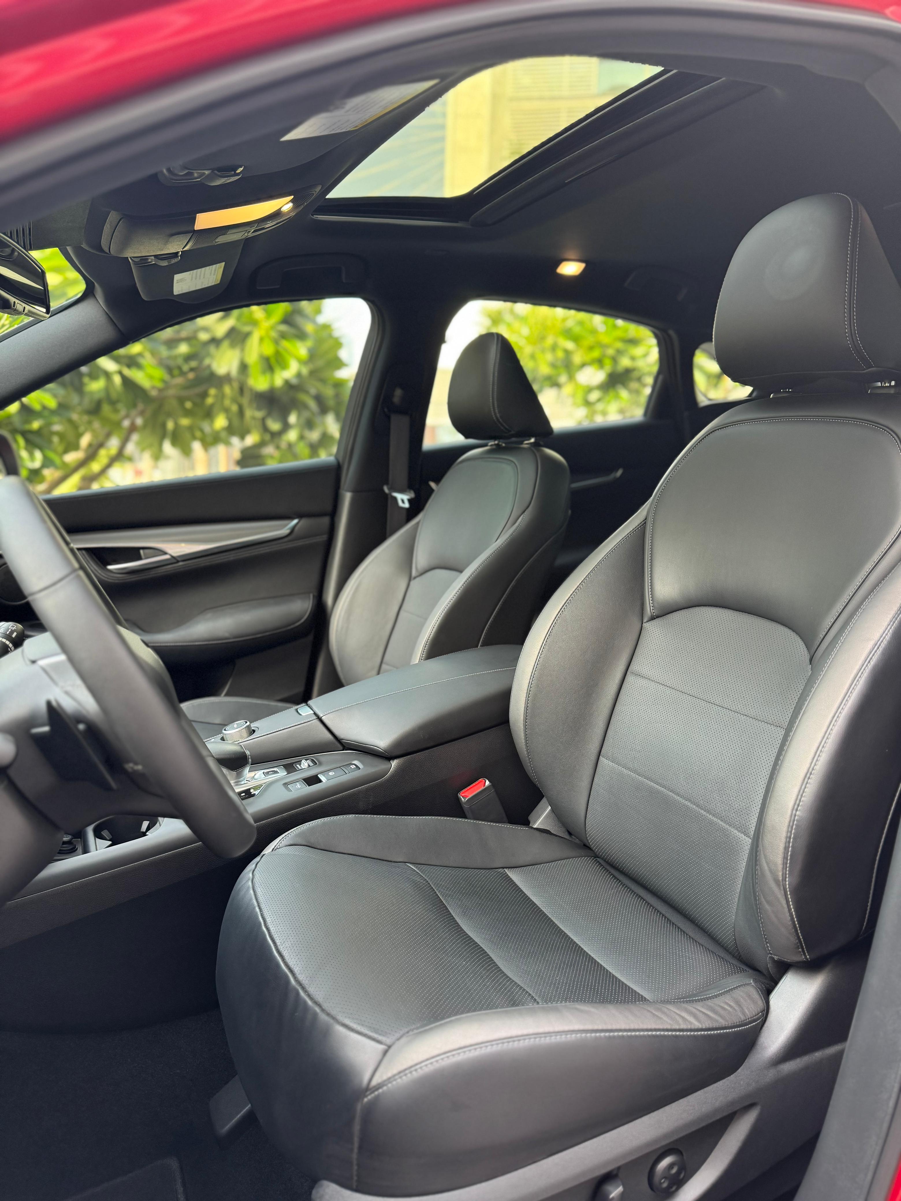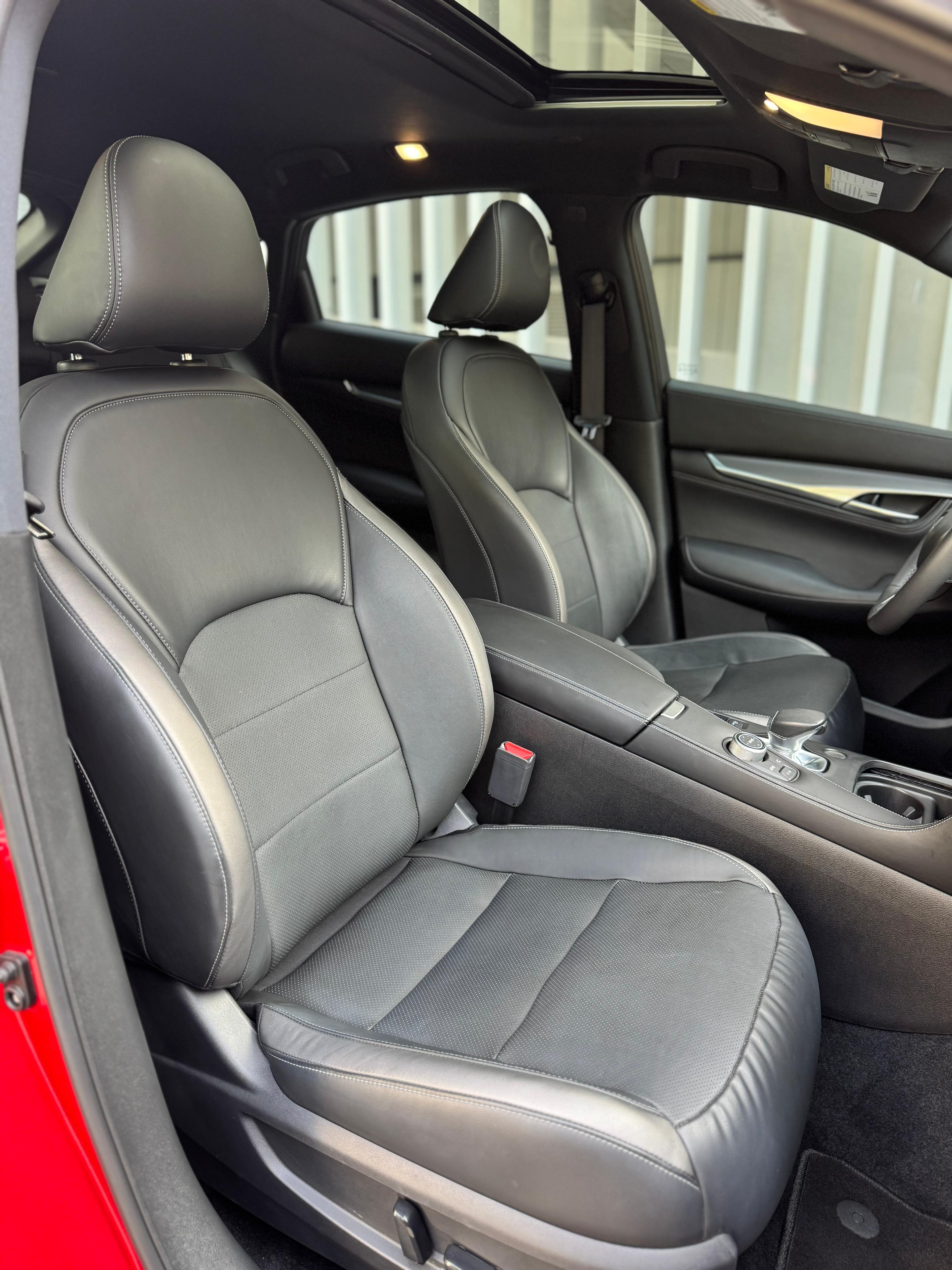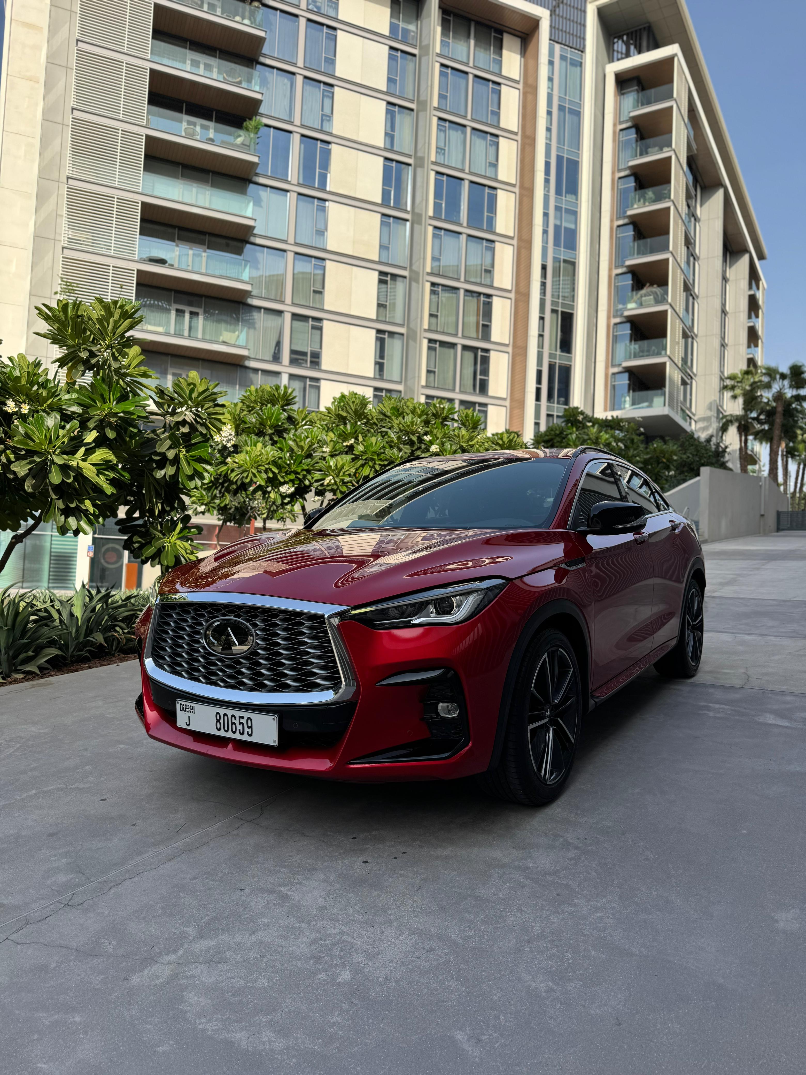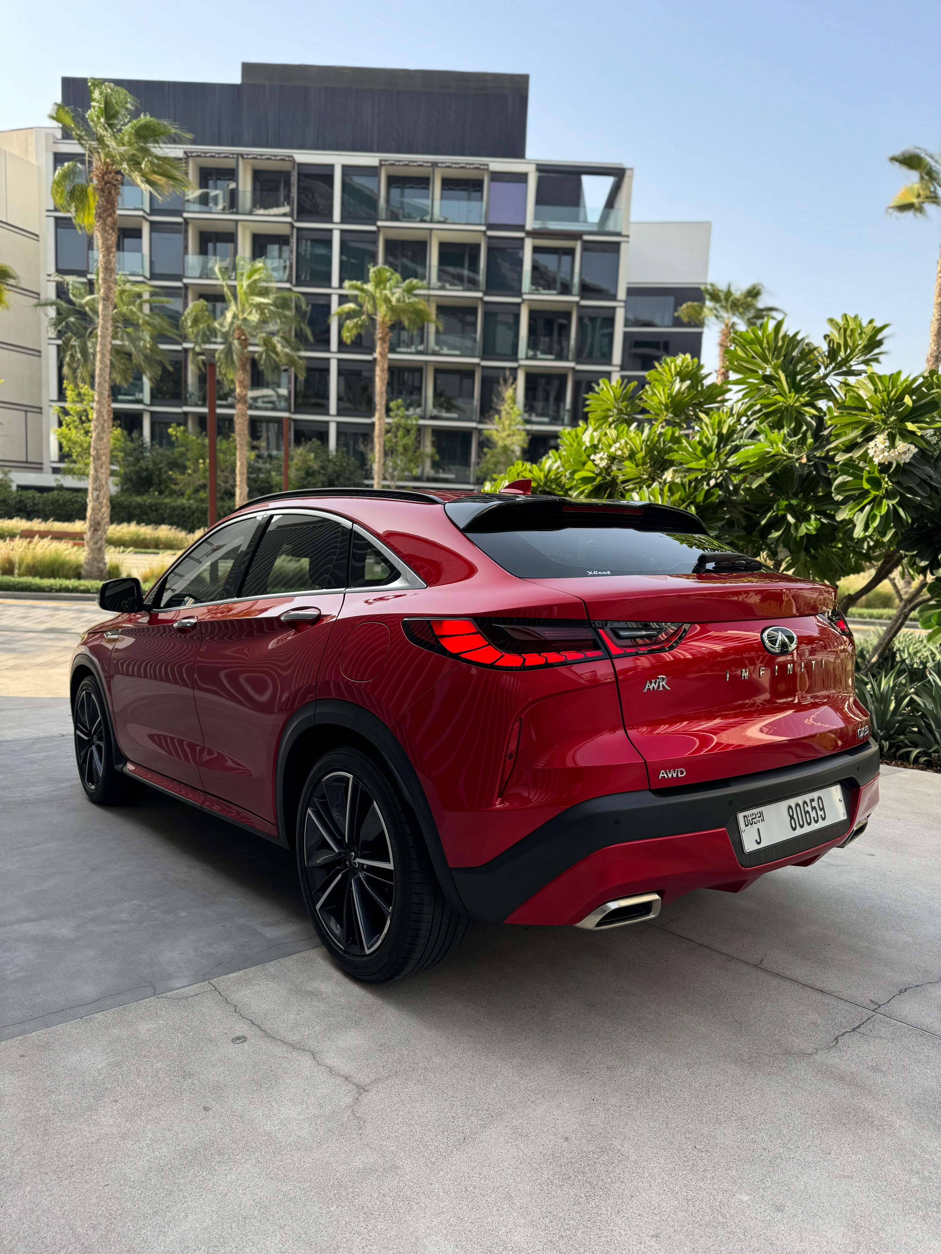 Infiniti QX55 – Model Year 2024 Specifications: Panoramic Sunroof Parking Sensors Power Seats LCD Screens Leather Seats Push Button Start Front Airbags Rear Air Conditioning Fabric Seats Alloy Wheels Why rent the Infiniti QX55? The Infiniti QX55 is a stylish crossover that offers a premium driving experience. With four doors and seating for up to five passengers, it also provides space for two medium-sized bags. This vehicle is equipped with a range of modern features, including a panoramic sunroof, parking sensors, power-adjustable seats, LCD screens, leather upholstery, and front airbags—ensuring both comfort and safety.